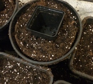 Ik gebruik 6,5-liter potten voor mijn planten en vul deze tot de rand met light-mix, een aardemengsel zonder al te veel voeding uit de growshop. Dan druk ik de aarde aan en geef goed water zodat de aarde mooi vochtig is. Ik maak een kuil met behulp van een leeg potje zodat het gat dezelfde grootte heeft als de kluit van mijn zaailingen. En zo is het heel makkelijk de zaailing inclusief wortelkluit over te potten. Gewoon uit het kleine potje halen, in de kuil zetten en de aarde rondom aandrukken. Klaar is Kees.