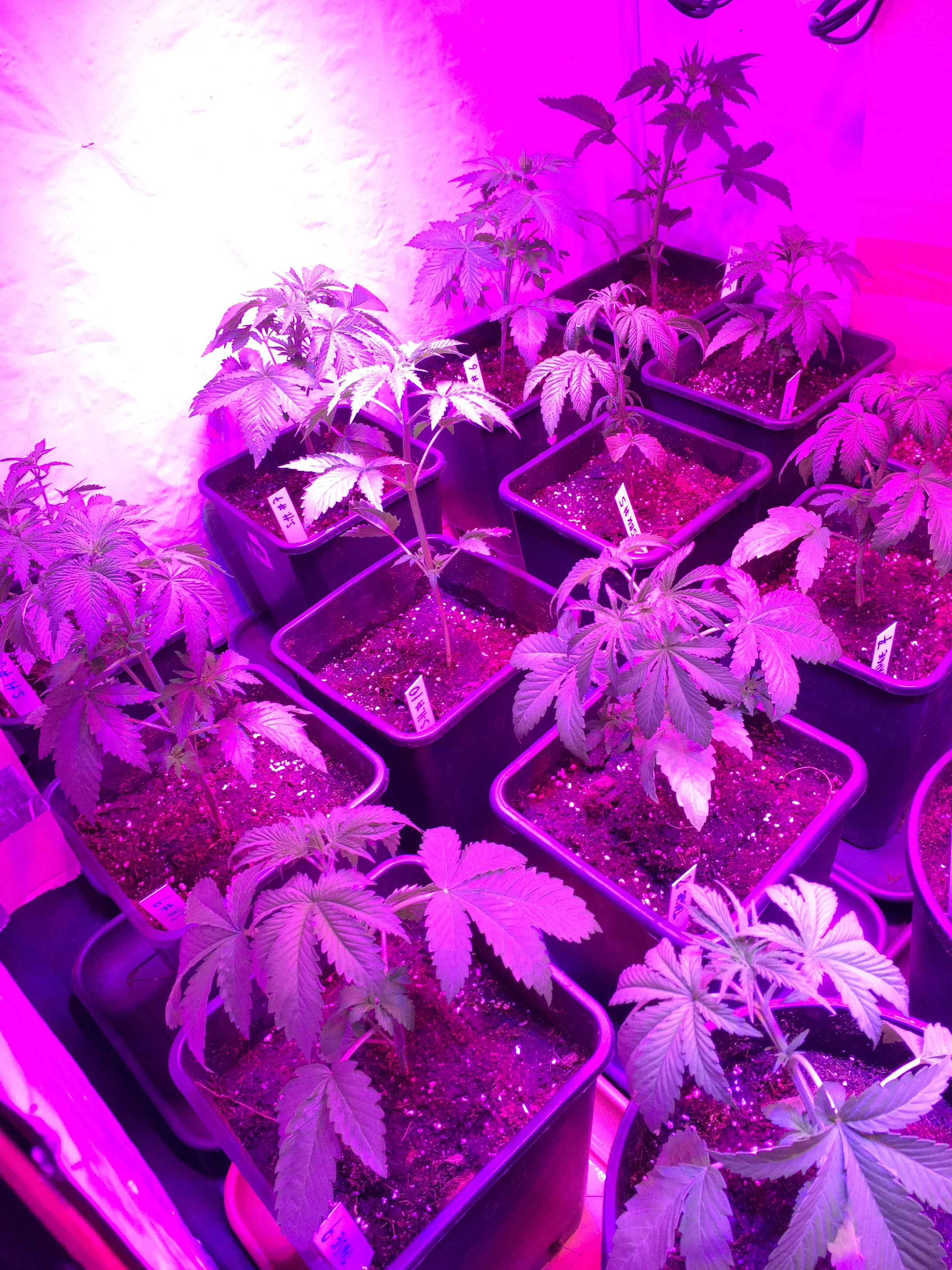 De planten heb ik nu verdeeld over de twee kweekkasten, de ene helft staat in de g-tools kast met de M30-modulen, en de andere in de grote kast met de 420-Sunfactor units. Ik heb van alle drie de soorten de planten over de twee kasten verdeeld om het verschil in ontwikkeling te kunnen zien. Nu staan in beide kasten een paar Tangie, Starbuds Sister x Biker Kush (SSBK) en Serious Happiness planten.