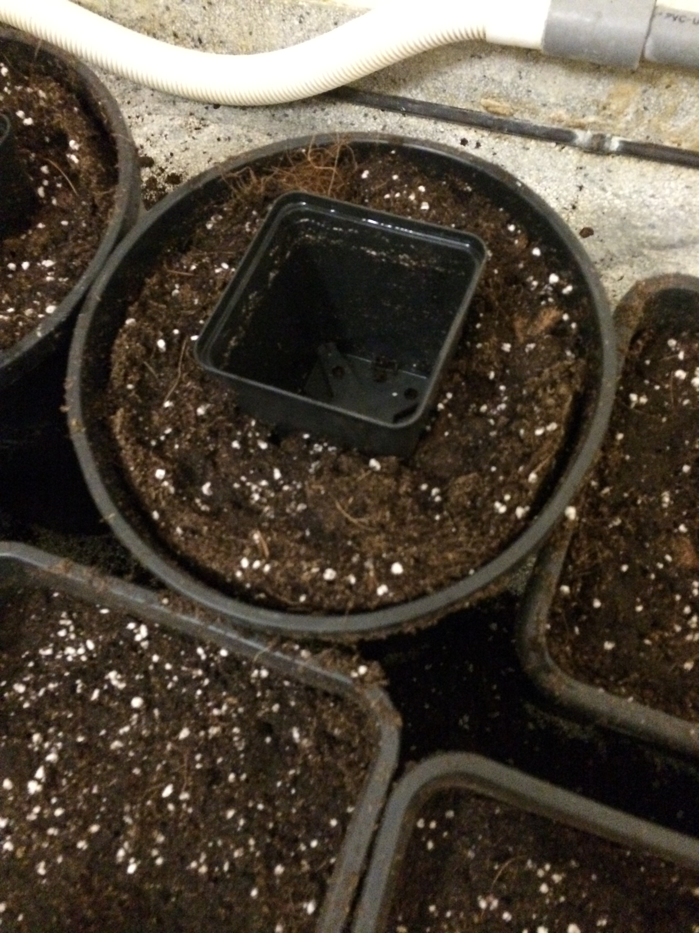 Ik gebruik 6,5-liter potten voor mijn planten en vul deze tot de rand met light-mix, een aardemengsel zonder al te veel voeding uit de growshop. Dan druk ik de aarde aan en geef goed water zodat de aarde mooi vochtig is. Ik maak een kuil met behulp van een leeg potje zodat het gat dezelfde grootte heeft als de kluit van mijn zaailingen. En zo is het heel makkelijk de zaailing inclusief wortelkluit over te potten. Gewoon uit het kleine potje halen, in de kuil zetten en de aarde rondom aandrukken. Klaar is Kees.
