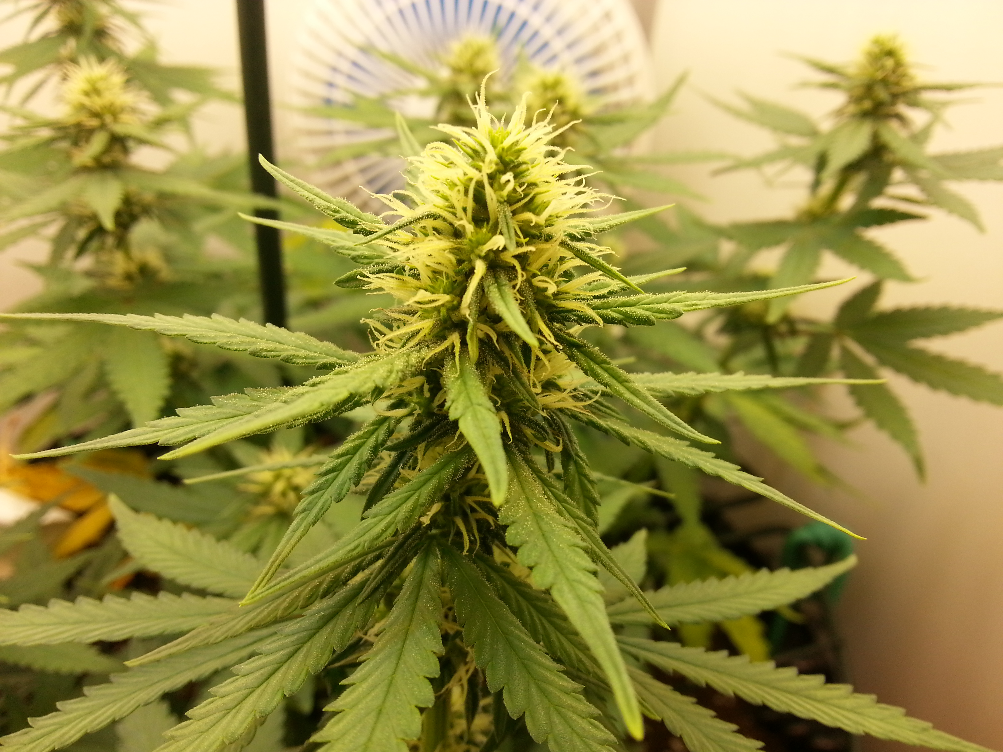 Terug naar de wietplant in mijn kweekkast. Deze mooie dame wil ook heel graag bevrucht worden. Om zoveel mogelijk stuifmeel op te kunnen vangen is ze daarom vast begonnen met de aanmaak van plakkerige hars. Deze harskristallen worden ook trichomen genoemd en bevatten onder andere het psychoactieve THC, maar ook de andere cannabinoïden die samen voor de werking van de wiet zorgen. Door zich met een plakkerig laagje hars te bedekken vergroot de wietplant de kans op bevruchting door met de wind meegenomen stuifmeelkorrels. Wat de plant uiteraard niet weet is dat er helemaal geen stuifmeelkorrels gaan komen.