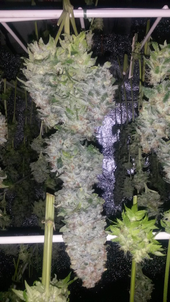Week 7, de Widow ziet er fabelachtig mooi uit, deze oude dame heeft de twee nieuwkomers vanaf de start onder de duim weten te houden. Haar toppen zij ontzettend mooi en plakkerig en werkelijk overladen met een dikke witte laag hars. White Siberian draagt inmiddels ook cola’s die dik boven de 30 centimeter lang zijn en counting… Tijd om te spoelen met schoon afgezuurd water, vanaf nu kregen de planten niets anders meer te drinken.