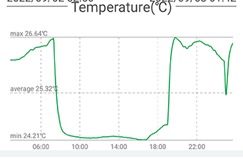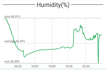 Maar goed, je maakt je zorgen over de luchtvochtigheid. Die is 50 tot 60% met de lamp uit en tegen de 70% als de lamp aan staat. De temperatuur daarbij is ongeveer 25 graden in het donker en 28 graden met de lamp aan. Ik snap dat dat verwarrend klink maar het is eigenlijk heel logisch dat de luchtvochtigheid oploopt als de lamp aan staat. Het komt omdat warme lucht meer vocht kan vasthouden dan koude lucht, en omdat de plant tijdens de warme en lichte uren meer gaat zweten.
