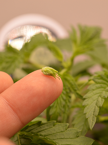Bij het toppen (het woord zegt het al) halen we het topje uit een wietplant. Daarmee bedoel ik de groeipunt van een tak of hoofdstam. Hierbij kun je alleen het allerkleinste groeipuntje weghalen, of wat meer als je plant bijvoorbeeld wat te hoog geworden is. Kijk maar eens op de foto’s hieronder. Links zie je een piepklein groeipuntje dat bij het toppen is weggehaald, en rechts zie je dat een veel langer deel van de hoofdstam is afgeknipt.