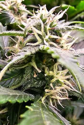 Het eerste dat me opvalt, is dat de bloeiharen vrijwel allemaal nog wit van kleur zijn. Ze zijn met andere woorden nog helemaal vers en dik. Naarmate de bloei vordert zullen steeds meer van deze bloeiharen indrogen en verschrompelen tot dunne kronkelige en bruin slash oranje gekleurde haartjes. Als dat bij zo’n 80 procent van alle bloeiharen het geval is, is dat één van de tekens die erop wijzen dat de top/plant klaar is voor de oogst.