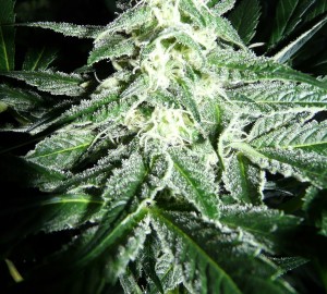 De planten staan er heel mooi bij, de kleur is prachtig donkergroen en de bladeren hebben een mooie glans over zich. Dit zijn gezonde planten. Ook de THC productie draait op volle toeren en de ruimte is ondertussen permanent gevuld met een heerlijke geur. Ik heb een foto genomen van een plant naast een honkbalknuppel zodat je de omvang ervan goed kunt zien. Ik verwacht dat de hoofdtoppen over een week of vijf ongeveer zo groot zullen zijn als de knuppel.