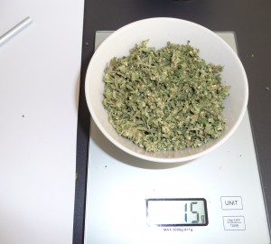 We nemen de 15 gram wiet en vermalen dit met een keukenmachine. Na het vermalen vullen we het nylon kousje met de wiet en doen er nog een kousje omheen, zodat we er zeker van zijn dat er geen kleine plantendelen door het kousje heen gaan.
