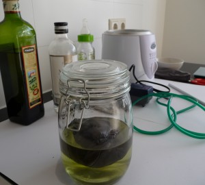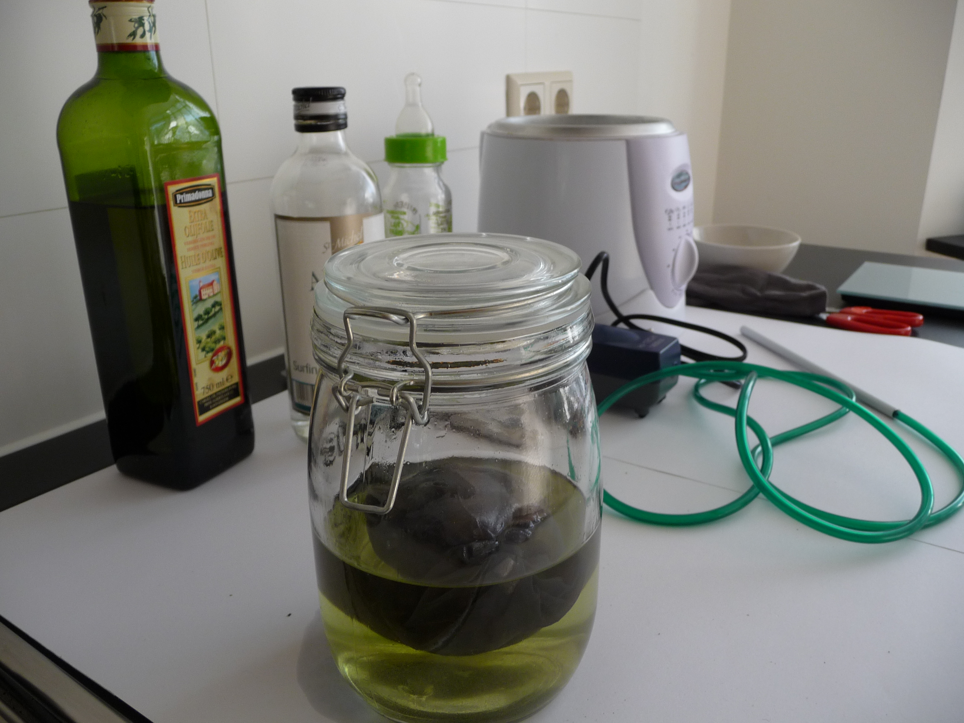 Het residu wat in de babyfles overblijft is een plakkerige substantie. Om het uit de fles te krijgen vullen we een van de pipet flesjes met een goede olijfolie, en gieten dit over in de babyfles. Terwijl het babyflesje nog in de mini frituurpan staat roeren we goed tot de wietolie in de olijfolie is opgelost.