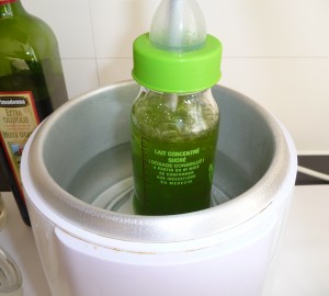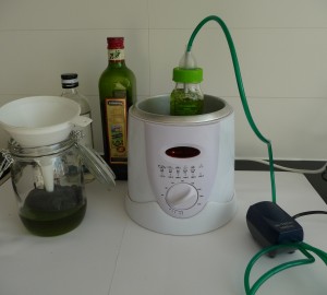 Nadat we het kousje met de wiet in de pot deden, goten we er alcohol bij tot het kousje helemaal onder de alcohol gedompeld was. De alcohol kleurt al vrij snel groen. Na 10 minuten roeren en schudden gieten we de groene alcohol over in de babyfles. De babyfles gaat nu au bain marie in het mini frituurpannetje op de laagste stand. Wernard gebruikt hier een babyflesverwarmer voor en zet die op de hoogste stand.