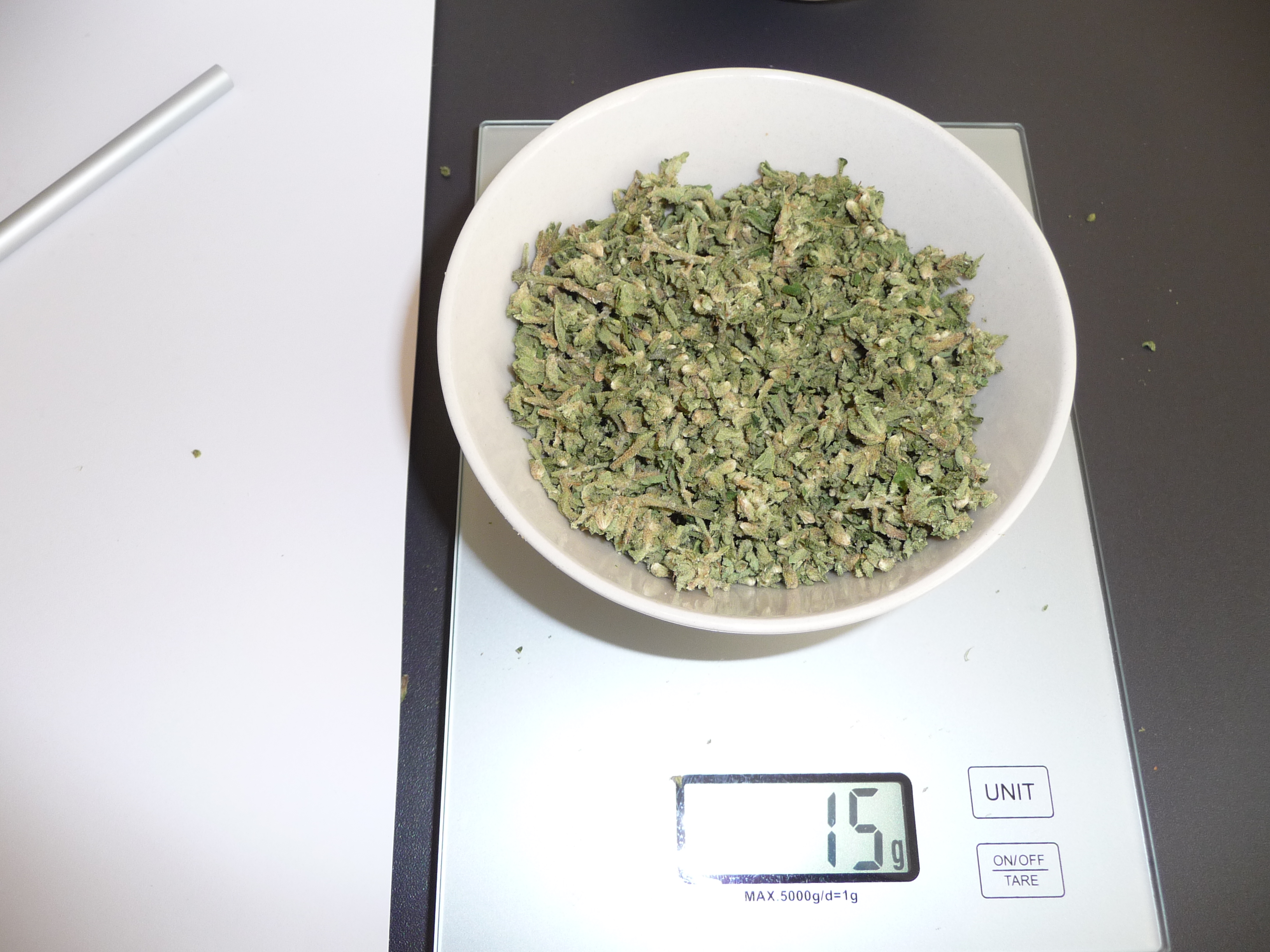 We nemen de 15 gram wiet en vermalen dit met een keukenmachine. Na het vermalen vullen we het nylon kousje met de wiet en doen er nog een kousje omheen, zodat we er zeker van zijn dat er geen kleine plantendelen door het kousje heen gaan.