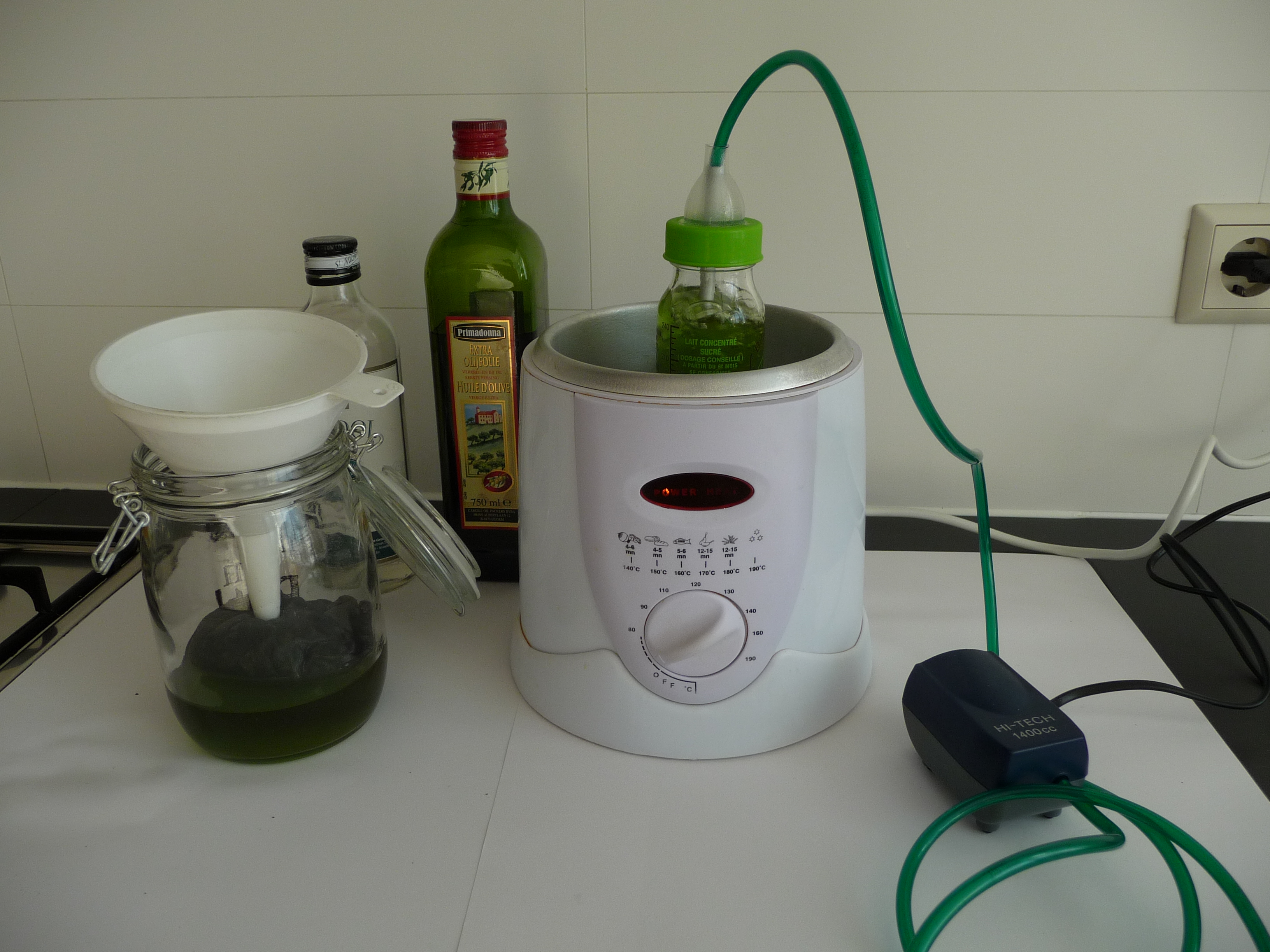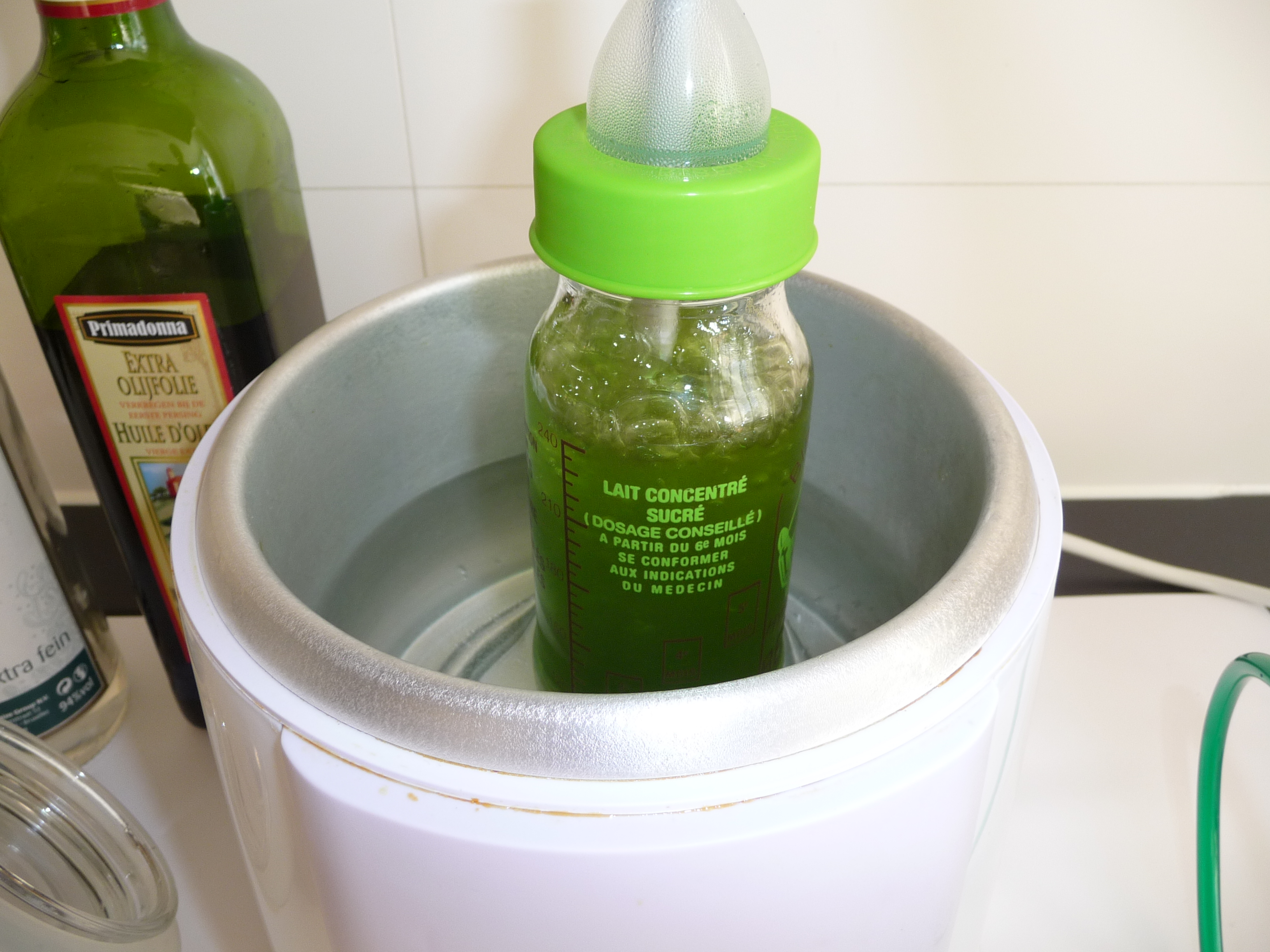 Nadat we het kousje met de wiet in de pot deden, goten we er alcohol bij tot het kousje helemaal onder de alcohol gedompeld was. De alcohol kleurt al vrij snel groen. Na 10 minuten roeren en schudden gieten we de groene alcohol over in de babyfles. De babyfles gaat nu au bain marie in het mini frituurpannetje op de laagste stand. Wernard gebruikt hier een babyflesverwarmer voor en zet die op de hoogste stand.