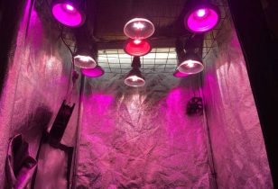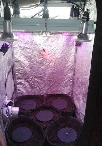 Voor ik van de zoete compacte toppen kan snoepen moet ik natuurlijk nog wel het nodige werk verrichten. Ik heb de zaden pas laten ontkiemen dus het zal nog wel even duren voor dat dat zover is. Ik kweek de 5 planten onder speciale LED spots in de DS60 kweektent van Secret Jardin. Om het lichtspectrum lekker breed te houden voor de planten, gebruik ik een combinatie van witte en paarse leds en TL. Ik heb 5 paarse leds van 14 Watt, 4 witte ledspots van 18 Watt, 1 TLD (de meest gangbare TL balk) van 18 Watt en een T5 (de dunnere nieuwe TL balken) van 18 Watt. In totaal verbruikt mijn kweekverlichting daarmee 173 Watt.