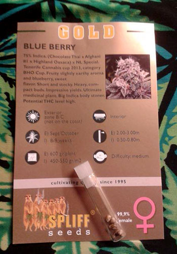Het liefste kweek ik paarse wietsoorten, ik vind het supermooi om te zien wanneer de toppen aan het einde van de bloei langzaam steeds paarser worden. Ook de smaak van de meeste paarse wietsoorten vind ik erg lekker, meestal hebben ze iets fruitigs in zich als bessen in combinatie met een fris zuur citrusaroma. Vandaar dat ik voor deze ronde koos voor de Blue Berry van Spliff Seeds. Een indica dominante kruising tussen Chocolate Thai, Afghani #1, Highland Oaxaca en een NL Special. Wat niet veel mensen weten is dat de originele Blue Berry van DJ Short de basis vormde voor ontzettend veel moderne wietsoorten. De Blue Berry van Spliff is in ieder geval zoet en zal zware compacte toppen moeten afleveren, ik ben benieuwd!