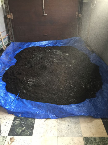 25 april, aarde gekocht, 680 liter bio potgrond met weinig voeding en zes verschillende bio toevoegingen van DCM: 1,5 kilo Kieseriet (magnesium), 1,5 kilo Bloedmeel (stikstof), 1,5 kilo Beendermeel (fosfor), 1,5 kilo Tuinkali (kalium), 1 kilo lavameel en 2 kilo zeewierkalk. Verder 50 liter perliet en een grote 12-literzak Mega Worm van Plagron. Dit alles heb ik goed door elkaar gemengd en een maand lang elke twee dagen bevochtigd en omgeschept.