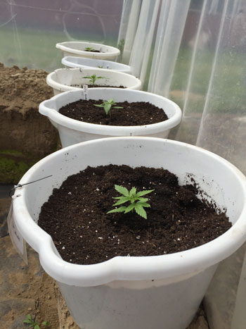 Op 4 mei is het effect van de nieuwe potjes te zien. De planten maken het goed. Ze zijn pas zo’n 10 centimeter hoog maar krijgen al een mooie structuur, kort en krachtig. Volgend jaar komt er een verwarmde bodem in de miniserre, dan kunnen ze wat sneller voorgroeien.