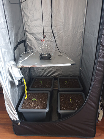 De nieuwe dames stonden eerst in de verhoogde G-Kit, maar moeten nu even plaats maken voor het droognet. Zodoende kamperen ze tijdelijk even in mijn kweektent. Zo hoef ik me niet druk te maken dat de dames zonder licht komen te zitten tijdens de verhuizing. Het nadeel is wel dat de kamer nu erg vol staat met twee kweekkasten én een kweektent.