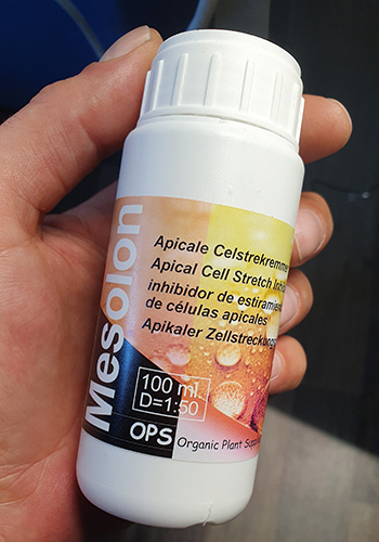 Deze plant (de plant links vooraan in mijn CNNBS G-Kit) is dus per ongeluk getopt. De andere vier dames heb ik behandeld met een apicale celstrekremmer genaamd Mesolon. Mesolon bevat natuurlijke plant-hormonen die ervoor zorgen dat de zijtakken zich meer ontwikkelen ten opzichte van de hoofdstam. Je mengt het met water (20 milliliter per liter) en spuit het als een spray op de plant.