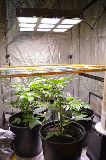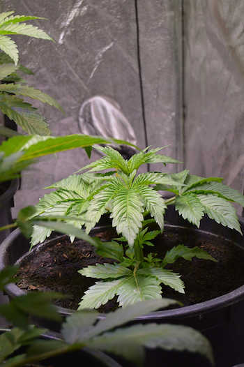Bij Barney Green staan drie Moon Walker Kush zussen, en één nakomertje. Om de planten op gelijke hoogte te laten komen voor de bloeifase die weldra aan zal breken, topt onze kwekende vriend de hoofdtoppen van de drie grote planten, kijken hoe dat uitpakt.
