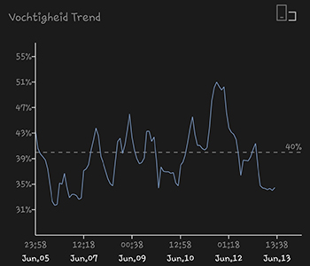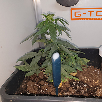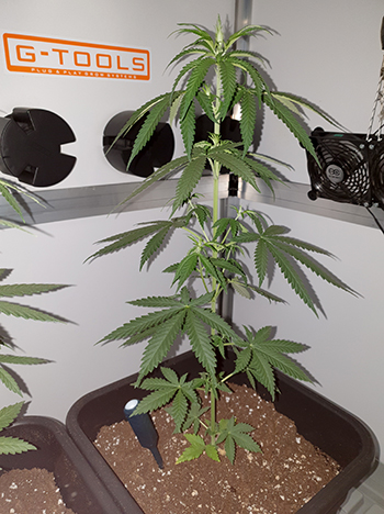 De G-Bars binnenzon (ik heb nog de 150 Watt versie; tegenwoordig kun je kiezen uit een 120 of een 160 Watt G-Bars) heb ik op een hoogte van 15 centimeter boven de Sneeze planten hangen. Ook deze staat inmiddels 12 uur aan en 12 uur uit, om de bloeifase op te wekken. De bewatering van de dames is deze week in een rap tempo toegenomen. Ze drinken nu dagelijks 350 milliliter water met voeding van Plagron. De gemiddelde temperatuur van de afgelopen week was 26,85 graden Celsius, en de gemiddelde luchtvochtigheid was 39,52 procent.