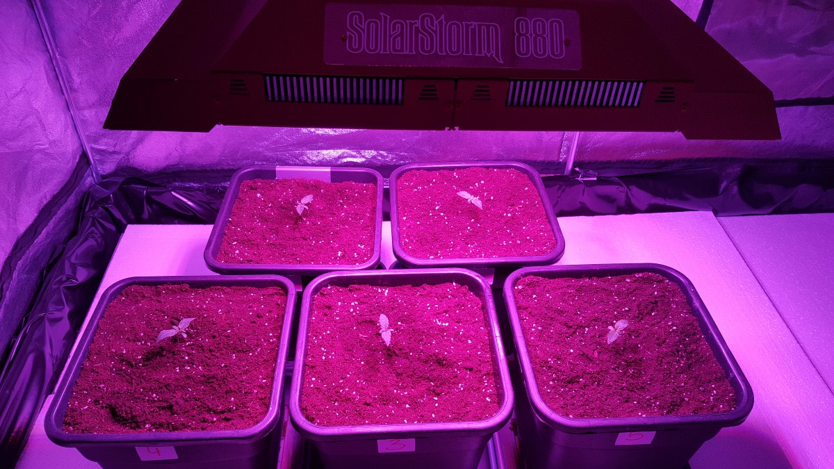 Onze vijf Lemon Haze vriendinnetjes van twee weekjes jong genieten van de Californische zon. Onder de LED verlichting van de SolarStorm 880, het paradepaardje van LED-fabrikant California Lightworks. Heerlijk met hun voetjes in light mix grond met perliet en een vleugje calcium kick.