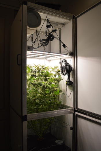 Om de kans op nog meer toprot zo klein mogelijk te houden, heb ik de Runtz x Layer Cake plant meteen maar even goed ontbladerd. Nu ze toch binnen een paar dagen omgaat, heeft ze al die blaadjes niet meer nodig. Door ze te verwijderen kun je de luchtvochtigheid behoorlijk omlaag krijgen; het scheelt al snel 10% of meer. De luchtvochtigheid in de kast is nu ongeveer 50%.