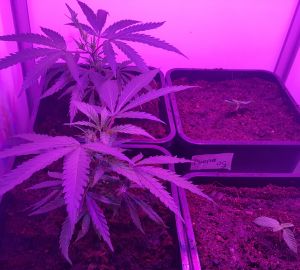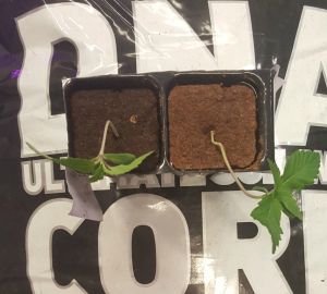 Om de plaats van de twee heren op te vullen, heb ik van een bevriende kweker twee gefeminiseerde zaadplantjes gekregen waar ik superblij mee ben! De dames zijn geen 3 weken oud, maar ongeveer 1 week geleden ontkiemd. Maar het zijn niet de minste soorten, namelijk een Purple OG en een Purple LA. Twee indica dominante F1 hybrides van DNA Genetics. De Purple OG is een kruising tussen de meervoudig cupwinnaar OG #18 en Purple Wreck en de Purple LA is een paarse kruising tussen een LA Confidential en een Purple.
