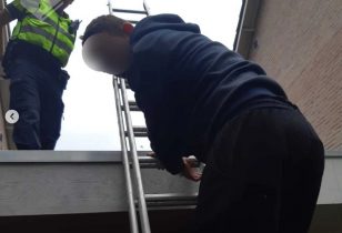 “Ik stond daar met een vent in de boeien op een plat dak. Ik zag dat iemand het gras aan het maaien was en schreeuwde hard, maar diegene hoorde me niet. Gelukkig had ik zo’n verkeersfluitje waarop ik blies. Toen kwam hij mijn kant op.”