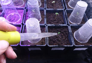 In de ochtend van 2 april kon ik 18 van de 26 zaailingen planten, en heb ik ze in de couveuse geplaatst. Na de pot een beetje ingewaterd te hebben, zijn de kiempjes in de 2-literpotten geplant. Daarna gaf ik de jongedames nog wat water met een pipet voorzien van Plagrons Seedbooster Plus. Als laatste zet ik over iedere zaailing een transparant bierglas om de luchtvochtigheid hoog te houden.