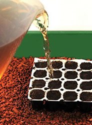 Wietzaden ontkiemen in Spongepots is een fluitje van een cent. Je begint met het aanmaken van het eerste voedingswater van je ongeboren zaailingen. Neem daarvoor een liter water van ongeveer 25 graden en meng de meegeleverde Bacto mix hier goed doorheen. Bevochtig de Spongepots met dit watermengsel en plaats ze in een minikasje of propagator. Wanneer je onderin de minikas of propagator een laag perliet legt kan dat overtollig water opnemen. Heb je geen perliet, zorg er dan voor dat je de Spongepots niet drijfnat maakt. Heb je water met Bacto over, bewaar het dan op een koele plaats voor later.