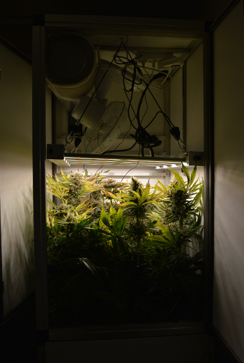 Omdat ik deze keer drie planten en twee scrogrekken in de kast had, kon ik de dames niet in hun geheel ondersteboven te drogen hangen. Eén voor één heb ik de takken afgeknipt, van de grootste schutbladeren ontdaan, en aan een lijntje opgehangen in mijn droogtent. Daarin draait alleen een afzuiger (met koolstoffilter) om de lucht te verversen en de geur te filteren.