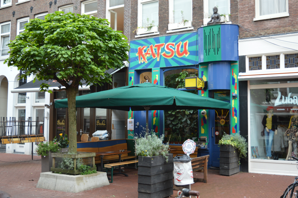 Het is nog vroeg op de dag als ik bij coffeeshop Katsu aankom. Terwijl ik een paar foto’s maak van de kleurig beschilderde gevel van de coffeeshop, tref ik op het nu nog lege maar gezellig ogende terras Ab. Hij is een van de drie eigenaren van de coffeeshop en een fervent fan van exclusieve sativa’s, zo leer ik later als ik de kans krijg om even aan zijn tafel te schuiven. ‘Het liefst rook ik Haze’, vertelt hij me, ‘de energieke high en het sociale effect van sativa’s, vind ik veel lekkerder dan het moker-effect van sommige van de zware indica’s. We hebben overigens wel veel mooie indica-dominante wietsoorten op het menu staan hoor. Er zijn nu eenmaal veel gasten die wel voor die zware body-stone gaan. Voor iedereen wat wils, zo is het gewoon.’