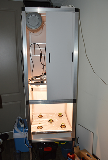 Als je goed hebt opgelet zie je ook dat het plantje links vooraan, wat kleiner is dan de rest. Ik had aan het begin van de week namelijk ook al last van de neerslag. Toen heb ik het hydrosysteem helemaal schoon moeten maken, en de wortels afgespoeld met een milde oplossing van waterstofperoxide (H2O2). Hierbij zijn de wortels van het plantje links vooraan beschadigd, waarna het plantje helaas is uitgedroogd. Gelukkig had ik nog een zesde zaailing op de reservebank 😉