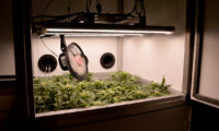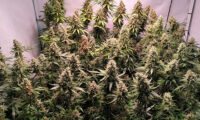 Na 72 uur in het donker en 6 dagen op 12/12, heeft Sneeze nog geen bloeiharen. De sativa dominante hybride vult nu wel bijna het hele kweekoppervlak.