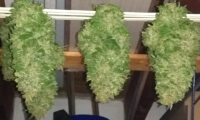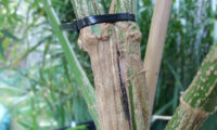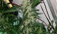 Kweekweek 12: de Mohammeds bloeien maar strekken ook nog steeds. Willie buigt en bindt ze omlaag om te voorkomen dat ze ’tegen de lamp lopen’.