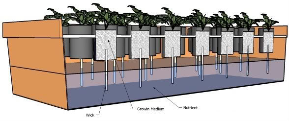 Kies een koord met een capillaire werking zoals nylon of katoen. Als één koord de aarde niet van voldoende water voorziet, kun je meerdere koorden per pot gebruiken. Het handigst is als je een grote bak gebruikt waarin de voedingsoplossing zit en daarin op verhogingen, de potten.