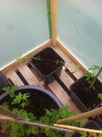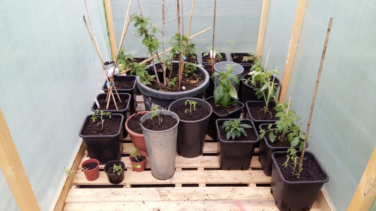 Links de deur van de kas, rechts de verhoogde palletvloer voor een goede afwatering en tegen koude voeten