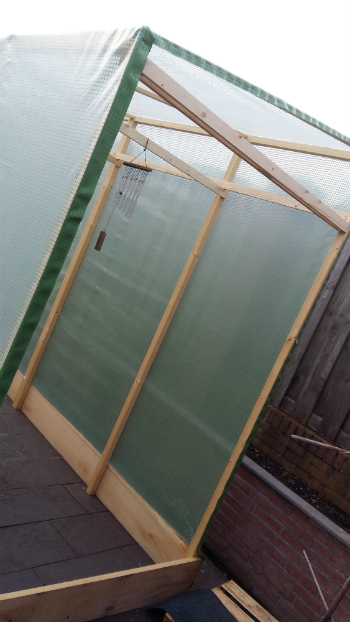 Het zogenaamde afwatervlonder zat er al snel in en dichterbij kwam het einde van de kasbouw. Een deur zou de kas compleet maken, 2 scharniertjes, wat panlatten en schroeven waren voldoende een doorgang naar wat later het wietveld zal worden. Later voegen we nog anti-insectenhor voor een raampje in de deur toe. In de hoeken van het dak hebben we 2 flappen geplaatst, deze luchtflappen kunnen open en dicht zodat we in het begin een warme en aangename temperatuur kunnen behouden en later wat ruimte hebben voor ventilatie, vocht en warmte afvoer.