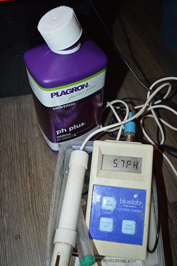 Of het echt een probleem is dat weet ik niet want de planten ontwikkelen zich gewoon goed. Het heeft ongetwijfeld ook iets te maken met de bloeifase en de ontwikkeling van de trichomen. Lastig is het natuurlijk wel, want als de pH-waarde te laag is kunnen de wortels ook geen voeding opnemen. Ik vul het waterniveau nu dus dagelijks aan, en stel de pH-waarde opnieuw in met pH-plus.