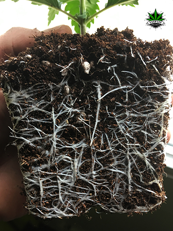 De rest van de zaailingen gaven we BiosmoZ microbes en bacteriën. We hadden net genoeg daarvan over, en omdat we er in de vorige ronde niet aan toekwamen, vonden we het wel een goed idee om daar ook eens de resultaten van te laten zien. De wortels groeiden zo hard dat de plantjes na 12 dagen min of meer rootbound waren, hoogste tijd om ze te verpotten dus!