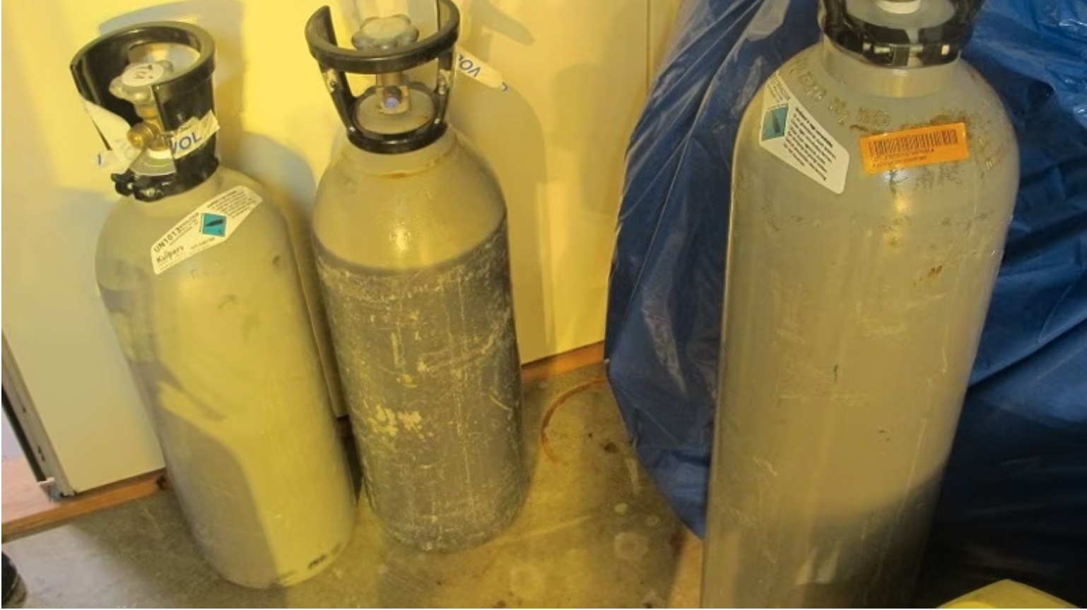 - CO2-flessen – door de politie bestempeld als “zuurstofflessen” – ontbreken niet