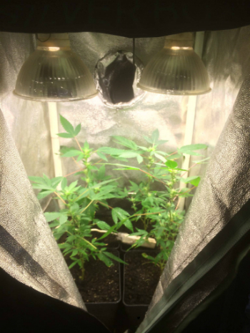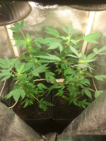 Het tentje waarin ik ook de Skunk-stekken had staan, gebruik ik nu voor vier Amnesia plantjes. Het is een tentje van slechts 30 bij 30 centimeter en 60 centimeter hoog. Qua oppervlakte dus kleiner dan een A4’tje. Om te bewijzen dat hobbykweken ook op deze manier kan en dus superklein en onschuldig is, laat ik de Amnesen in deze tent ook afbloeien. Ze staan onder 4 x 23 watt Phillips Downlighter spaarlampen, in totaal maar 92 Watt aan licht dus.