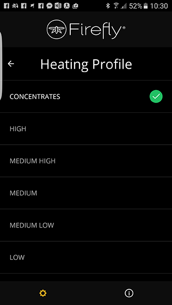 Wanneer je concentraten in de Firefly 2 gaat gebruiken heb de meegeleverde concentrate pads nodig. Deze gaan in de bowl, en daarop een beetje concentraat. Let op dat je niet zoals ons teveel concentraat gebruikt, minder is echt meer wanneer het op concentraten in de Firefly 2 aankomt. Je doet namelijk heel lang met een klein beetje en omdat de Firefly 2 op een lagere temperatuur verdampt als je zou dabben, is de smaak werkelijk subliem! Dikke rookwolken zoals bij gebruik van een roodgloeiende dabnagel krijg je echter niet. Hier staat tegenover dat je veel efficiënter met je concentraat om kunt gaan en veel langer kunt ‘verdabben’. Wel is het jammer dat het niet zonder app kan, wat ons betreft zou het gebruik van de app geen vereiste moeten zijn maar een bonus.