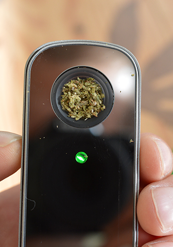 Na deze ietwat lange inleiding is het tijd om de Firefly aan het werk te zetten, we beginnen met wat wiet. Om dat in de verdamper te stoppen, verwijder je simpelweg de magnetische bovenplaat. Eronder verschijnt dan een spiegelende glazen plaat met vooraan in het midden de bowl van mat geslepen glas en metaal. Extra gaasjes zijn niet nodig en de wiet kan direct in de bowl. Er gaat maar ongeveer 0,2 gram gemalen wiet in de bowl maar daar heb je meer dan genoeg aan, je haalt er met gemak 10 tot 15 haaltjes uit.