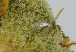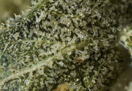 De toppen zien er mooi en gezond uit. Veel van de trichomen zijn helder en maar enkelen zijn troebel. Er zijn maar weinig amberkleurige trichomen te zien. Naar onze mening is deze wiet misschien wat vroeg geoogst. Het valt op dat er aan de buitenkant van de top nog aardig wat trichomen intact gebleven zijn. Niet zoveel als aan de binnenkant natuurlijk maar het laat wel zien dat de top met enige zorgvuldigheid behandeld is.