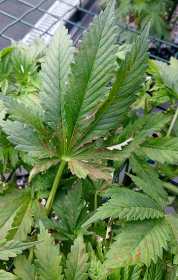In mijn laatste update hebben jullie kunnen zien dat mijn dames als netjes hun weg door de scrogrekken aan het vinden waren. Toch was niet alles koek en ei de afgelopen maand, ik lag lekker te genieten op het strand tot ik vanuit het thuisfront de onderstaande foto’s kreeg doorgestuurd. Mijn dames leken een soort van roest op hun bladeren te hebben! Na een snelle zoektocht op internet kwam ik tot de conclusie dat dit wel een soort van schimmel moest zijn, die normaal gesproken veel bij sierplanten voorkomt en zich vooral bij vochtig weer en koude nachten razendsnel ontwikkeld. En vochtig weer en koude nachten hebben we in Nederland genoeg gehad de afgelopen tijd.