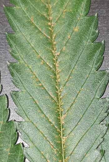 Hallo Harley, ik zie wat je bedoelt. Naast de roestige vlekjes valt ook de paarse steel van het blaadje op. Samen met het feit dat je op kokos kweekt, doet het me vermoeden dat je met een calcium/magnesium tekort te maken hebt. Als je geen extra calcium/magnesium (CalMag) aan je planten geeft, en alleen de Canna basisvoeding voor kokos gebruikt dan is de kans groot dat dit inderdaad de oorzaak is.