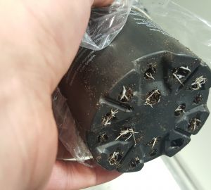 Hallo lieve lezers, toen ik vrijdag een kijkje in mijn kweekkastje nam, zag ik dat de jongedames hun potjes vrij snel hadden leeggedronken. Ik heb ze toen uiteraard water gegeven en de potjes afgedekt met een stukje plastic zodat er niet teveel water kon verdampen en de plantjes in het weekend genoeg te drinken zouden hebben. Toen ik vandaag terugkwam waren de potjes alweer bijna droog en zag ik dat er al veel worteltjes uit de onderkant van de potjes groeiden.