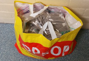 De camouflage gele ‘OP=OP Voordeelshop’-boodschappentas waarmee dumb en dumber hun lading vervoerden.