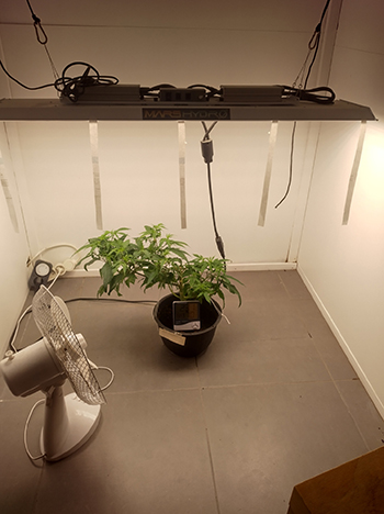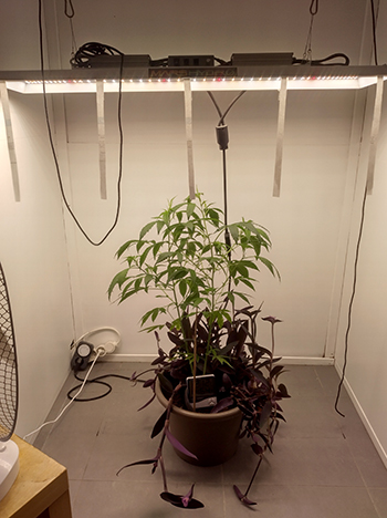 Dan over naar mijn tweede kweekproject, namelijk de vier plantjes van de CNNBS buitenwiet-test. Die groeien niet heel erg hard en zijn een beetje gestrekt. Dat komt omdat ze in mijn tuin maar een paar uurtjes per dag direct licht krijgen. Ze staan ook tussen andere planten die al wat hoger zijn, waardoor ze een beetje de hoogte in gaan.