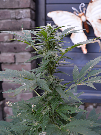 Tenslotte wil ik nog even de twee 24k Gold planten in mijn tuin laten zien. Toen ik mijn vorige verslag schreef, waren die nog niet aan de bloeifase begonnen maar nu staan ze vol in bloei. Beide planten nam ik als stekje van de 24k Gold planten van mijn vorige kweekronde, omdat het zo’n mooi fenotype was. De plant heeft overal toppen die niet heel dik worden maar wel heel compact zijn, en plakken als de neten. Dit fenotype was daarnaast aanzienlijk eerder klaar dan de overige vier feno’s.