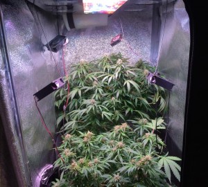 Om de schade verder te beperken heb ik de twee aangetaste toppen uit de voorste plant rigoureus afgeknipt en ook het een en ander aan schutbladeren uit de planten geknipt. Zo wordt het bladerdek weer open en kan er meer lucht doorheen waardoor vocht sneller afgevoerd wordt. Daarnaast heb ik 4 extra PC ventilators in mijn tent opgehangen. Ik hoop nu dat de budrot net als de trips daarmee wegblijft zodat mijn planten rustig kunnen afbloeien. Ik heb wel even genoeg van die narigheid en mijn toppen kunnen nog best wat groter groeien.
